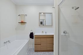 Central bathroom has a tub, toilet, shower and vanity.