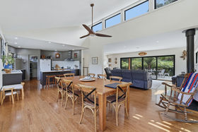 Open plan lounge and dining area with multiple sliding doors accessing the decks.
